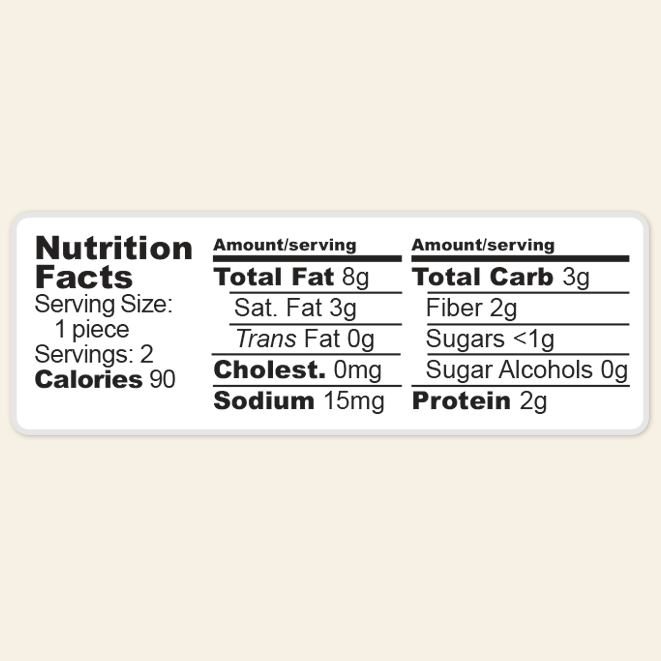 Includes 2 handmade maca peanut butter cups weighing about 1.65oz. This is 77% dark chocolate. A terrific option for ketogenic and low carb diets.